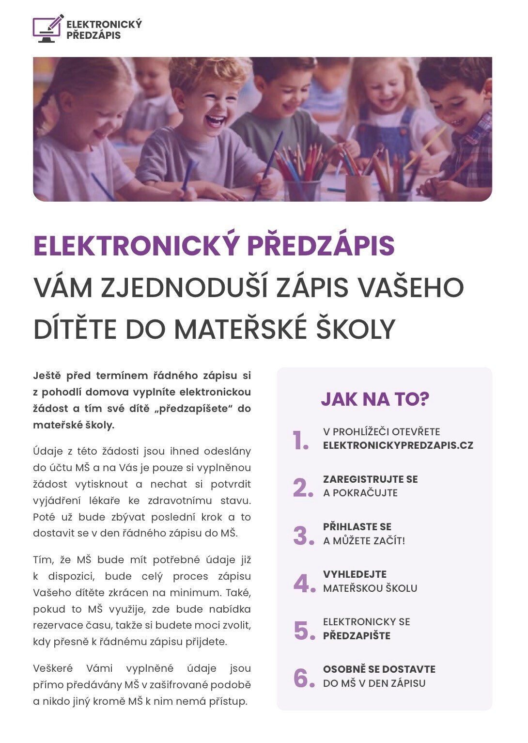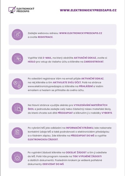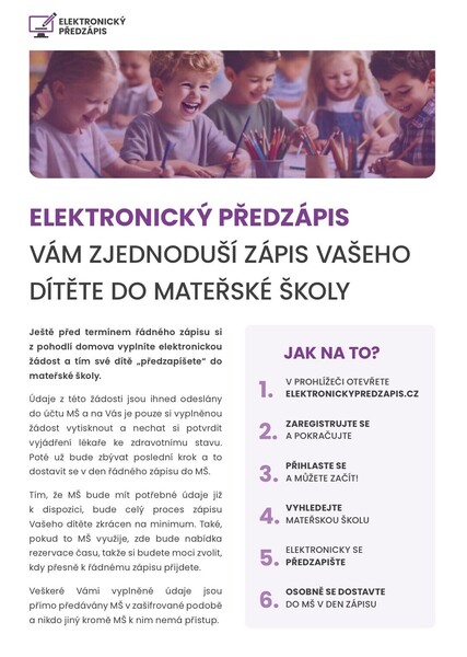 pro usnadnění a urychlení zápisu Vašeho dítěte do naší mateřské školy můžete využít Elektronického předzápisu a to od 18.2. - 17.3.2026