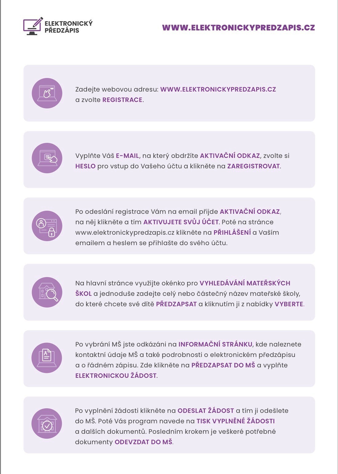 Dále Vás program navede, jaké další kroky je potřeba podniknout (tisk vyplněné žádosti, návštěva lékaře) a vše potřebné doručit do MŠ stanoveným způsobem v termínu řádného zápisu.